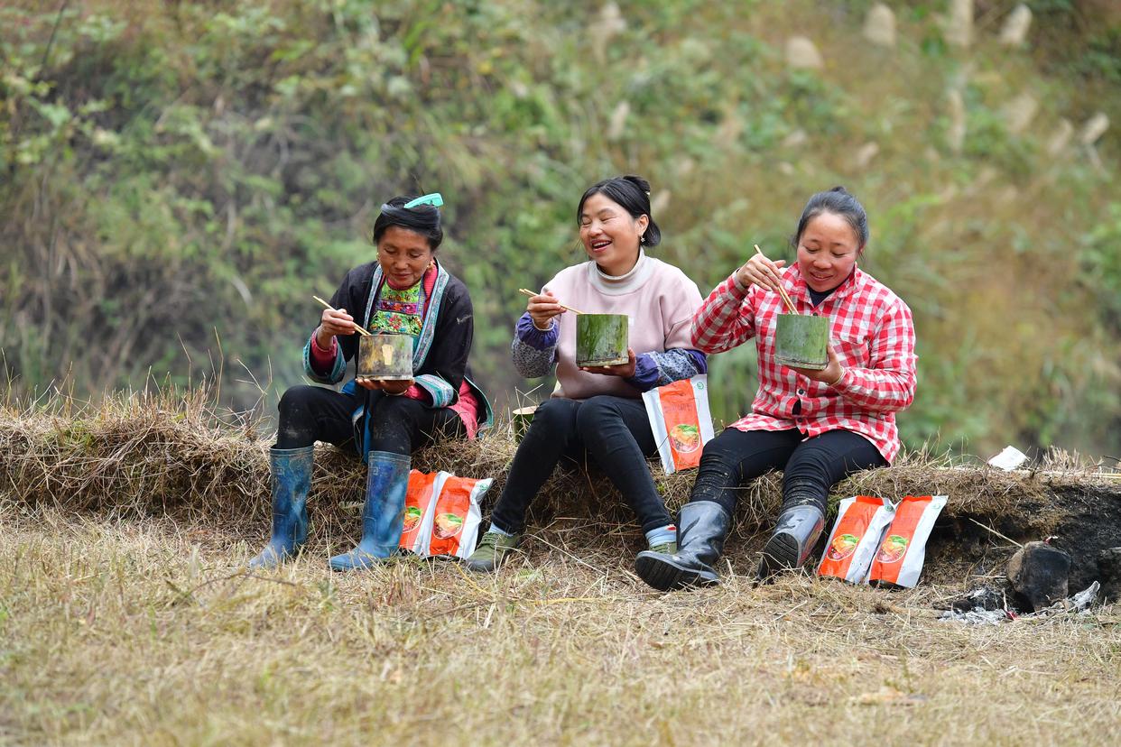 广西融水苗族自治县杆洞乡党鸠村妇女们在田边吃螺蛳粉(2021年12月10日摄)。新华社记者 黄孝邦 摄