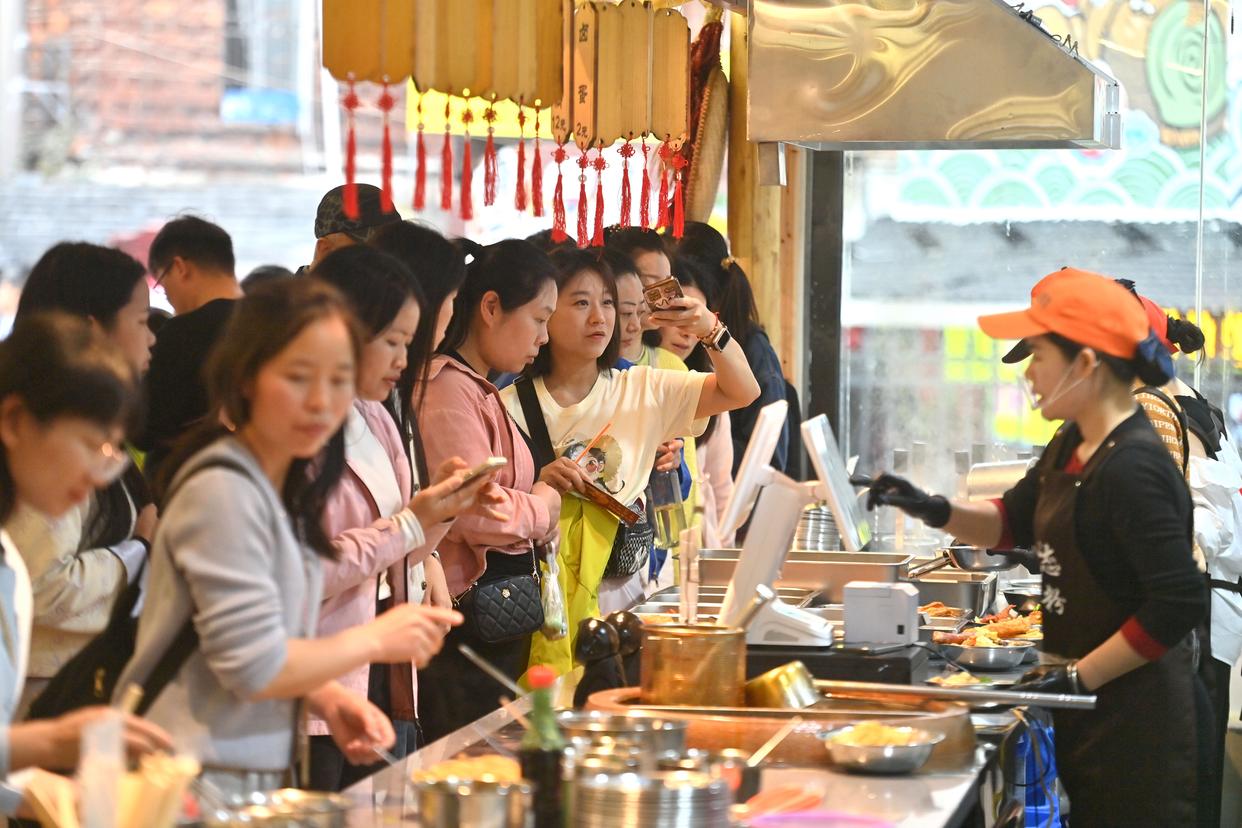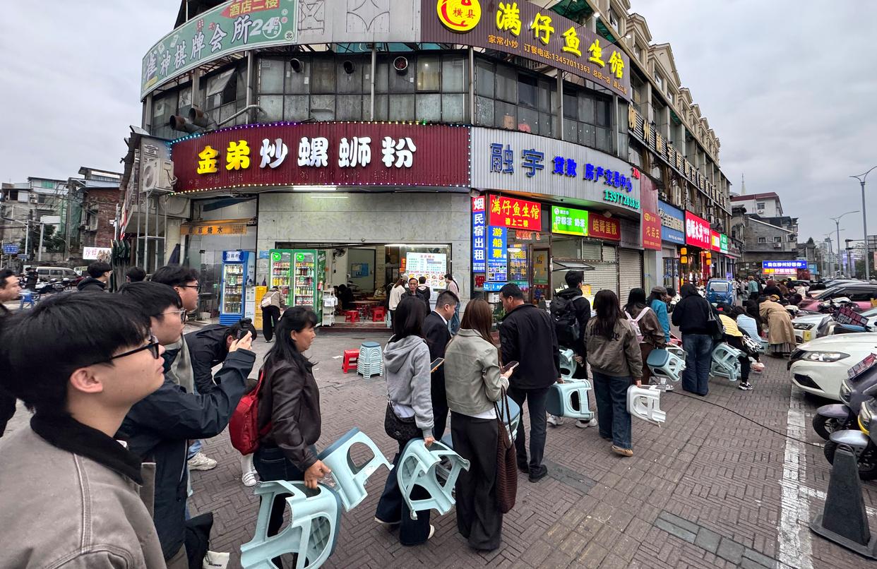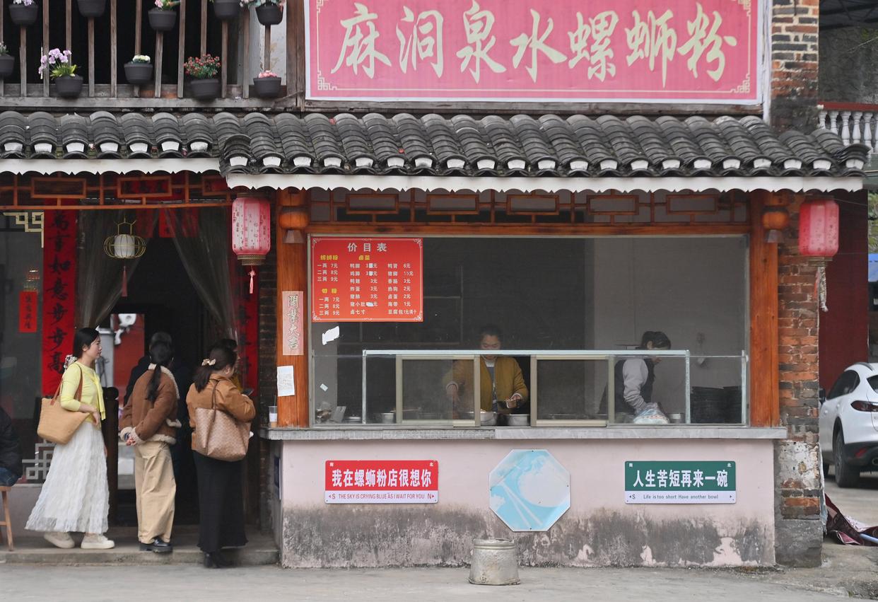 游客在广西融水苗族自治县融水镇新国村一家螺蛳粉店排队购买螺蛳粉(2026年3月7日摄)。新华社记者 黄孝邦 摄