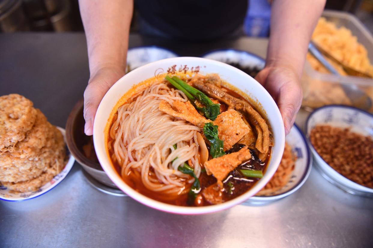 在广西柳州市沿江路一家螺蛳粉店,店主将刚刚煮好的螺蛳粉递给顾客(2026年3月10日摄)。新华社记者 黄孝邦 摄