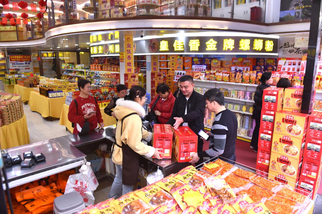 在广西柳州市青云民生市场一家特产超市,游客在选购螺蛳粉(2026年3月10日摄)。新华社记者 黄孝邦 摄