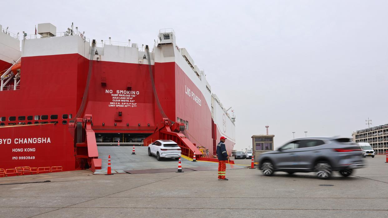 3月24日,工作人员在码头引导国产新能源汽车驶入汽车滚装船。新华社记者 方喆 摄
