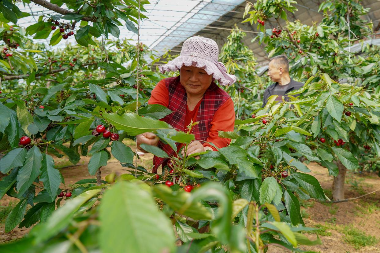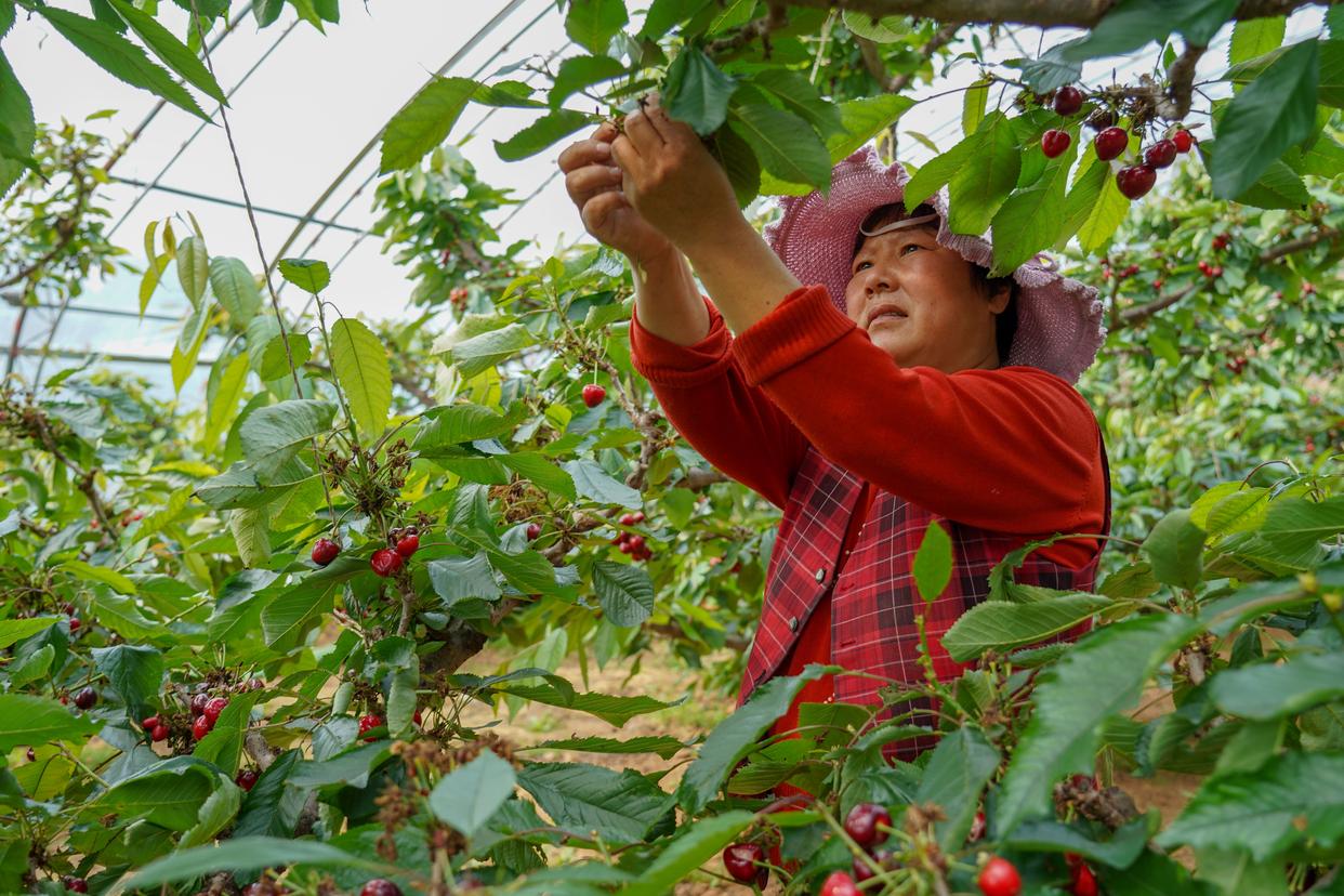 3月24日,万德街道新刘村村民在自家大棚采摘樱桃。新华社记者 朱峥 摄