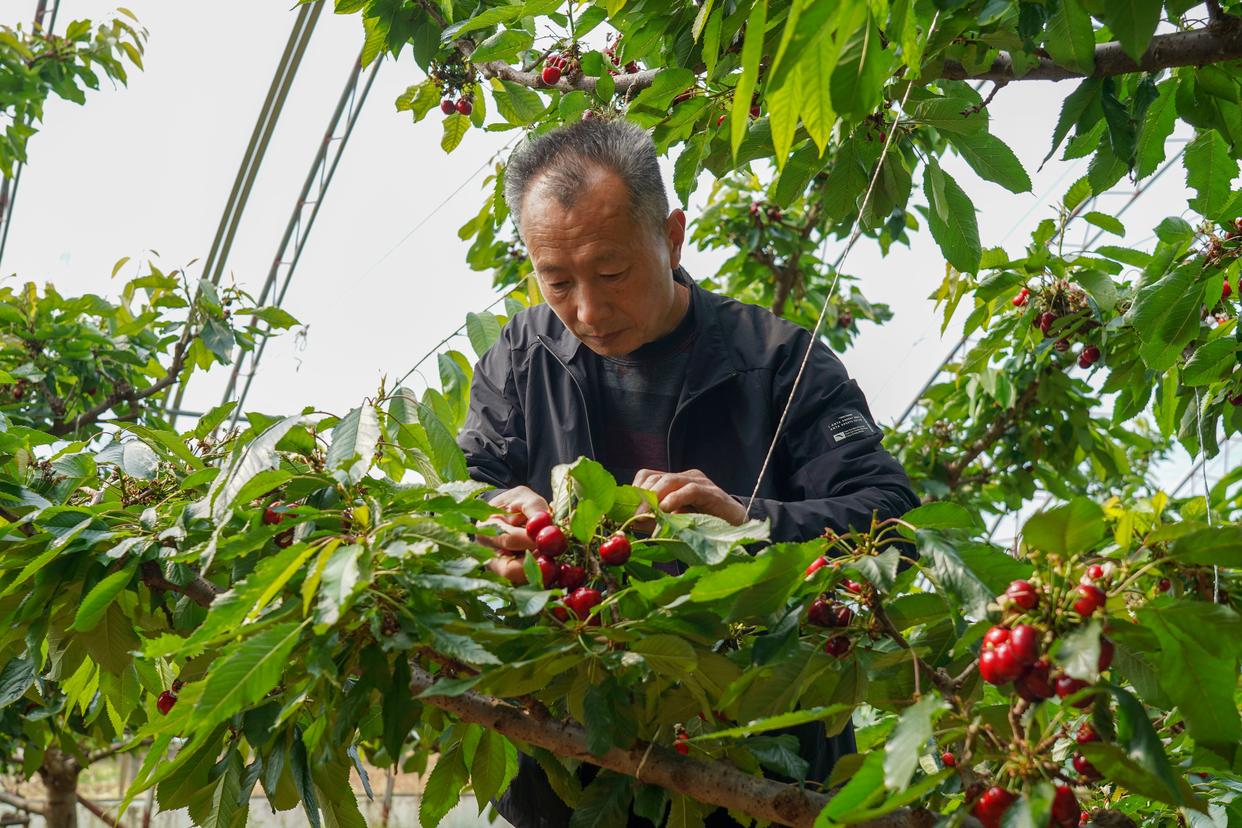 3月24日,万德街道新刘村村民李承峰在自家大棚采摘樱桃。新华社记者 朱峥 摄