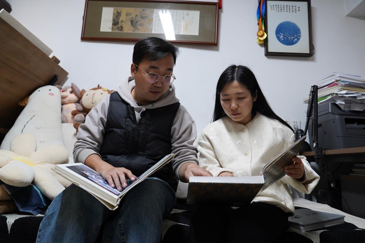 曹浪、胡韵月夫妇在查阅书籍设计陶瓷样式(3月11日摄)。新华社记者 周密 摄