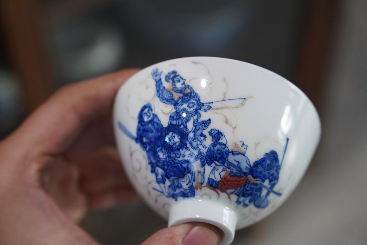 这是曹浪、胡韵月夫妇创作的《西游记》主题青花瓷茶具(3月11日摄)。新华社记者 周密 摄