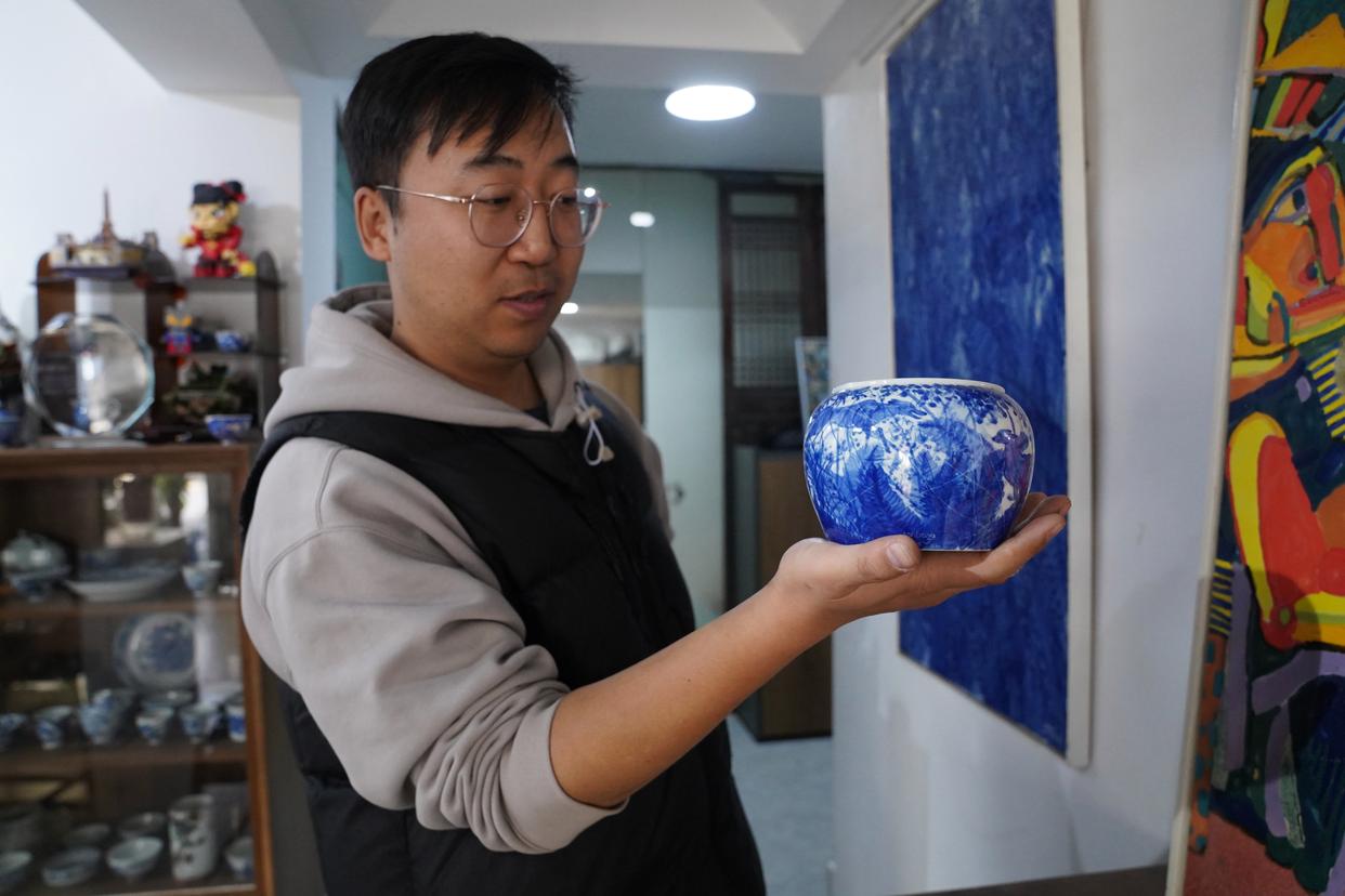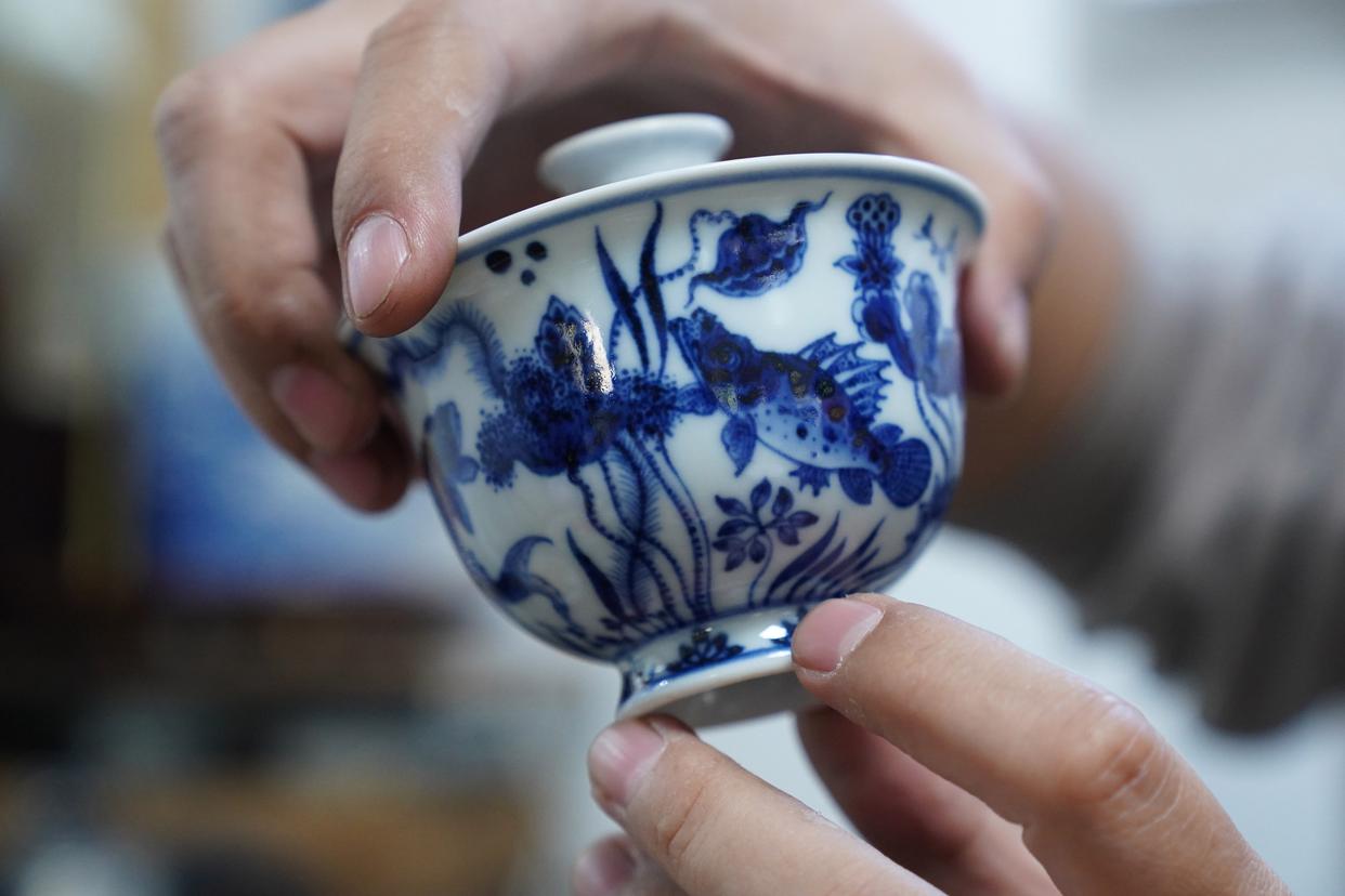曹浪展示融入油画技法创作的青花瓷茶具(3月11日摄)。新华社记者 周密 摄