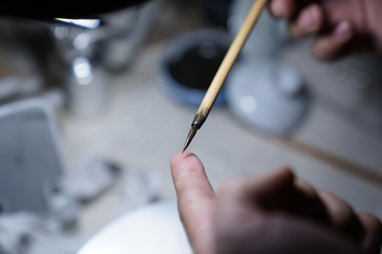曹浪展示他画青花瓷时的专用毛笔(3月11日摄)。设计一件青花瓷时,他需要用这样的毛笔在一个杯子上画几天甚至数周。新华社记者 周密 摄