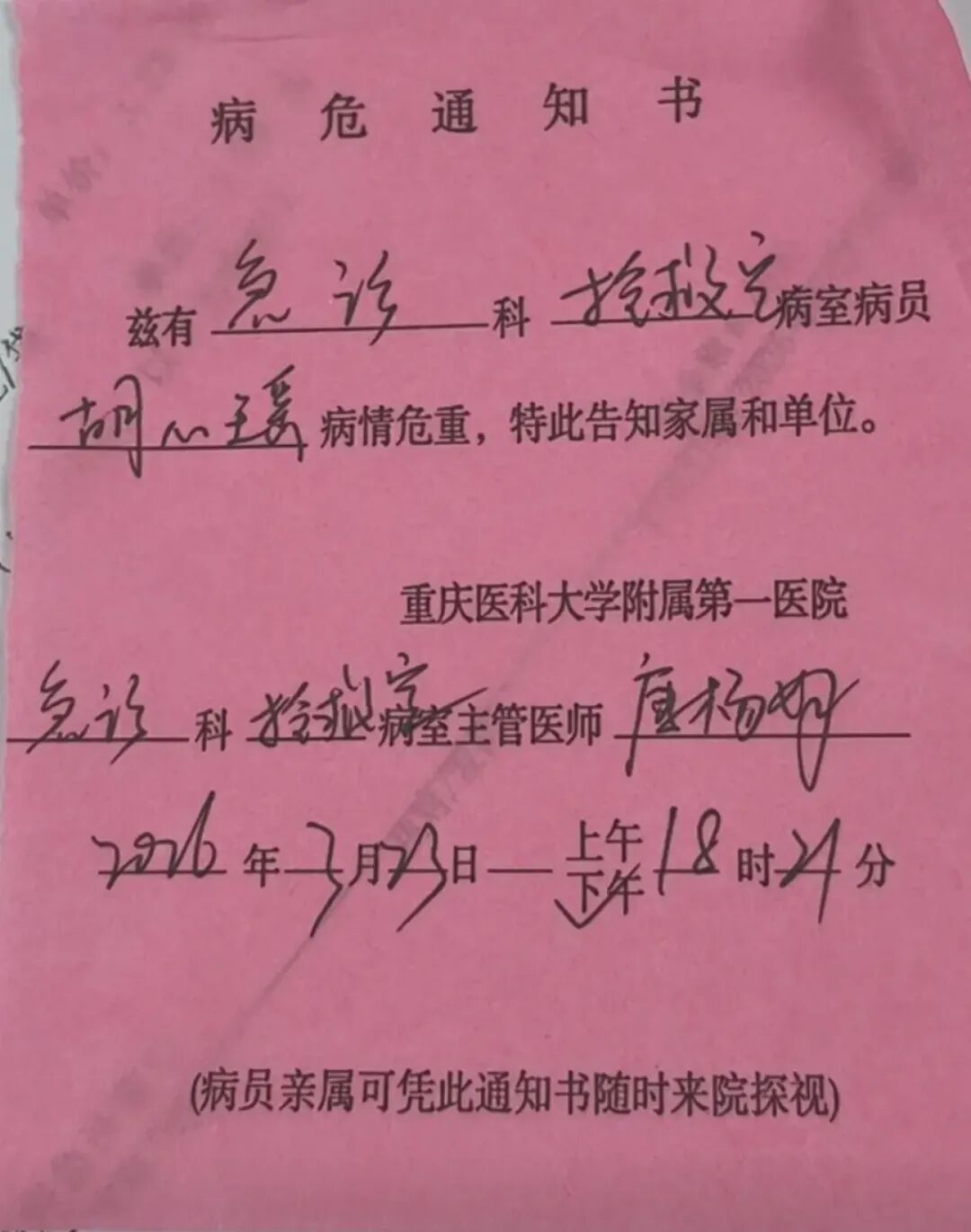 胡心瑶病危通知单