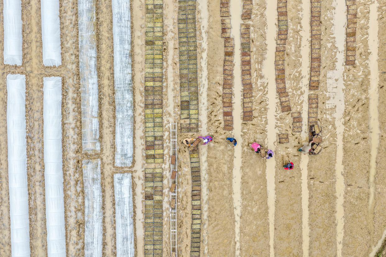 3月24日,农民在田间摆放水稻育秧盘(无人机照片)。新华社记者 唐奕 摄