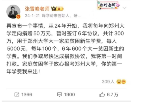 2024年1月21日,他发布微博,从2024年开始,将每年向郑州大学定向捐赠50万元,暂时签订6年协议,共计300万,用于郑州大学大一家庭贫困新生学费,每人5000元,每年100个……微博还提到,“家庭贫困学子放心报考郑州大学,你的第一年学费我来出! ”