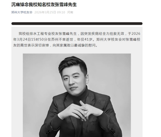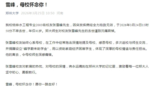此外,郑州大学微信公众号也发文,对张雪峰的去世致以沉痛哀悼。