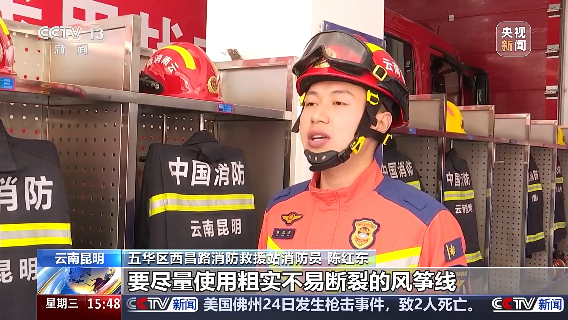 五华区西昌路消防救援站消防员 陈红东:放风筝时要选择安全空旷的地方,要尽量使用粗实不易断裂的风筝线,尽可能选择有明显标识的风筝线,注意佩戴好防护装备,戴上手套要注意观察周围,保护好自身的同时,也要注意好周围行人的安全。