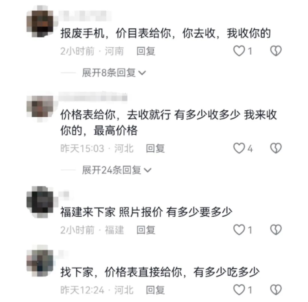 记者注意到,在不少公共平台上,近期出现了不少“招下家”的回收信息。多位上家发布价目表,列明各类报废手机、废旧数码产品的回收价格,吸引下线回收商前来收货。有上家在信息中明确表示,“有多少要多少”,只要内存大、芯片型号对路,好坏通收。