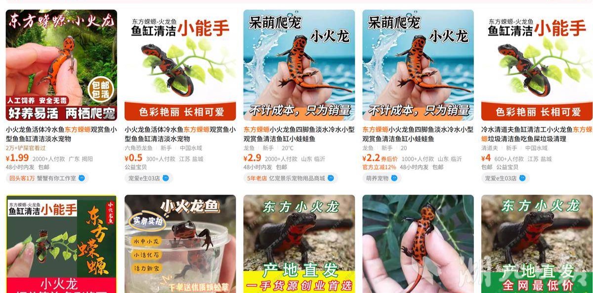 在部分中小学周边的文具店、流动摊贩处,以及大量电商平台上,东方蝾螈被冠以“中国火龙”“六角恐龙”“可爱小水龙”等名称公开售卖,单只价格从3元到15元不等。商家往往将其装在透明的小塑料盒中,以“好养活”“模样可爱”为卖点,却鲜有标注其毒性或安全风险。