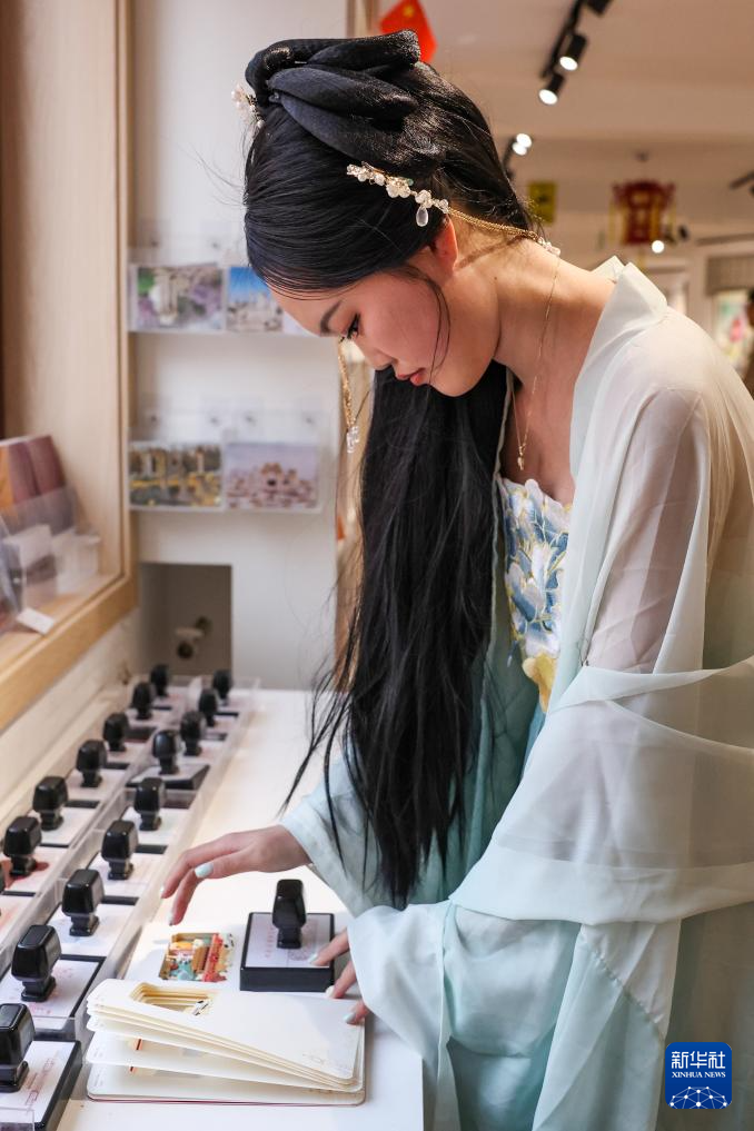 3月23日,一名游客在圆明园收集创意印章。