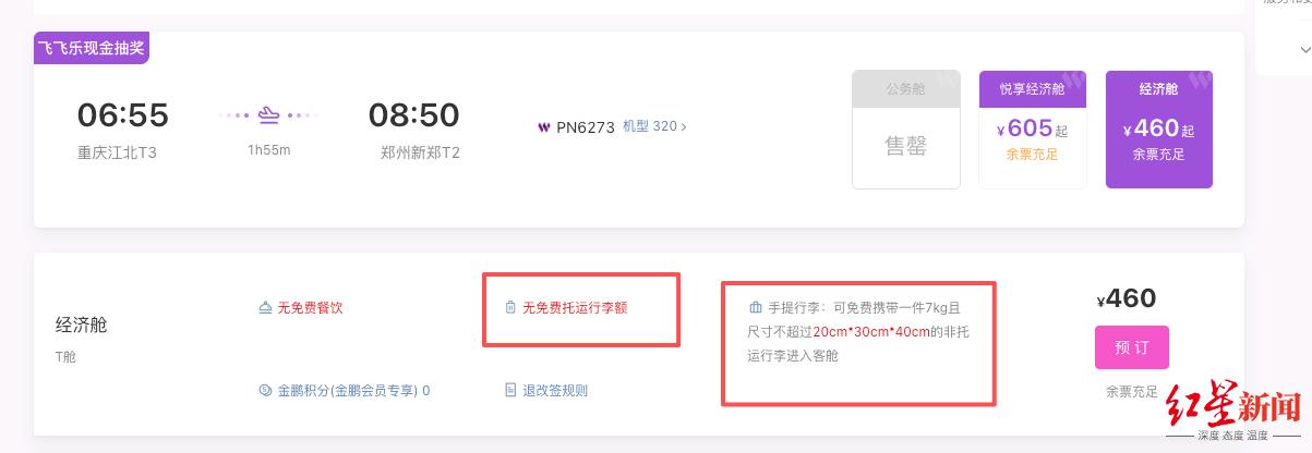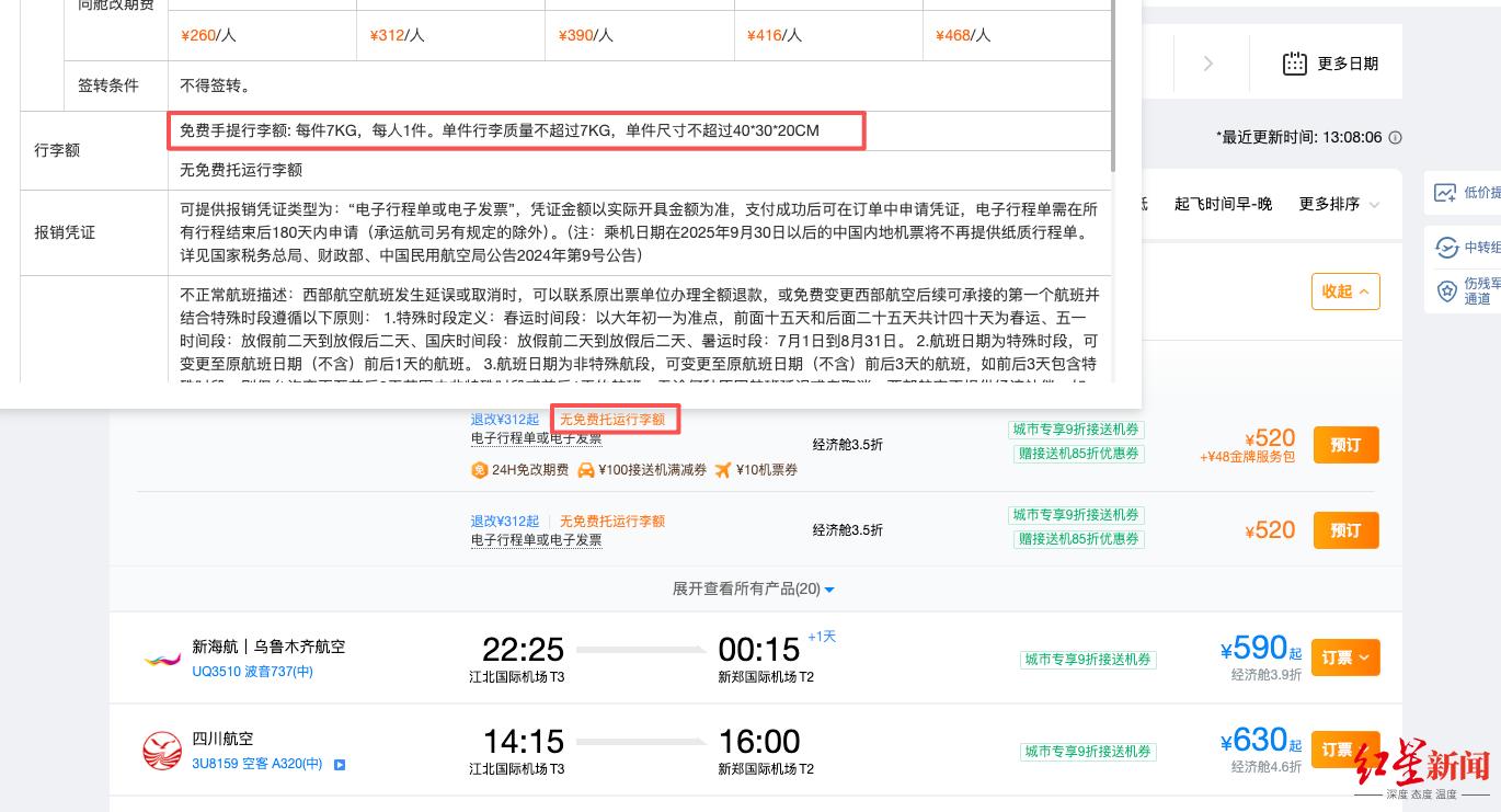 红星新闻记者体验发现,在西部航空官网购票时,页面有非常清晰的“可免费携带一件7千克且尺寸不超过20厘米*30厘米*40厘米的非托运行李进入客舱”提醒,其中数字部分标红。官网首页也有相应提醒,进入客服页面点击付费行李后,能看到更详细的要求和收费标准。但在飞猪、携程等平台购买其机票时,提醒并不明显,携程官网只有一个“无免费托运行李额”提示,点击后才能看到手提行李的重量和尺寸要求,且没有超标的收费标准。飞猪则会在订单页面显示免费手提行李规格的特殊提醒,点开后可看到相关规定。