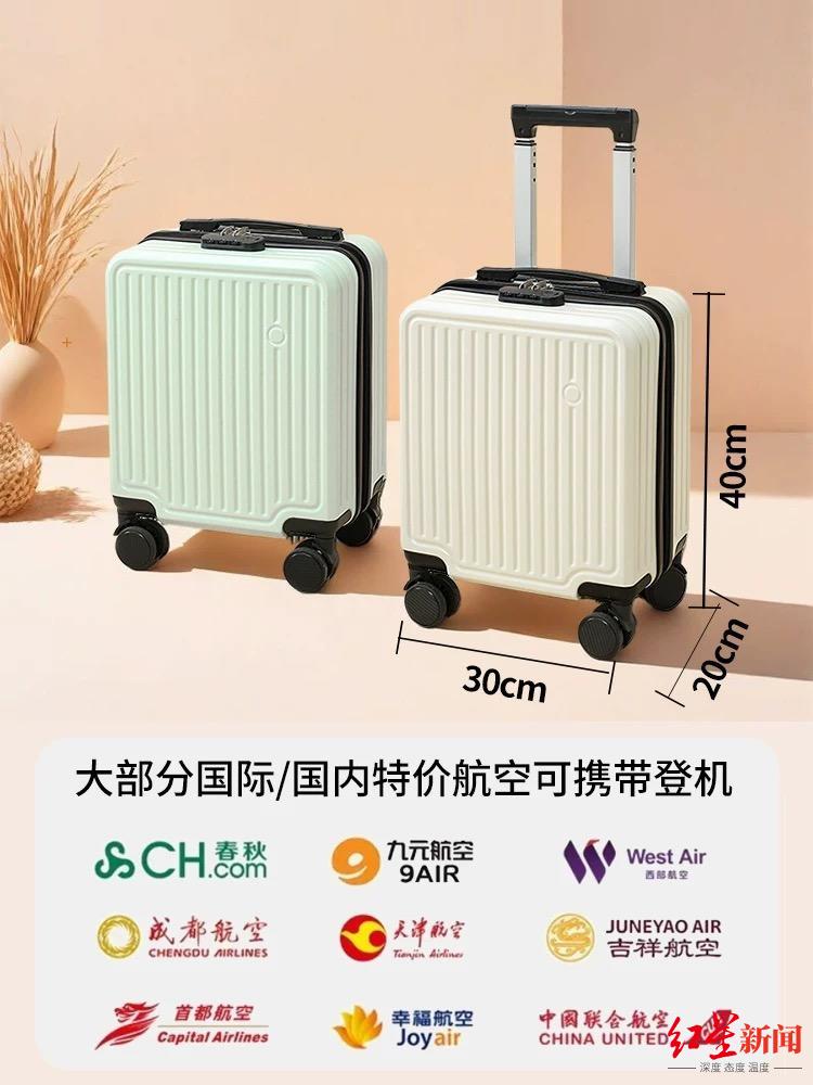 红星新闻记者注意到,55×40×20厘米的行李箱,在电商平台一般会被标注为20寸登机箱,是差旅中十分常见的尺寸。而20×30×40厘米的行李箱,一般被称为迷你行李箱,很多商家会标注“特价航空可用”。