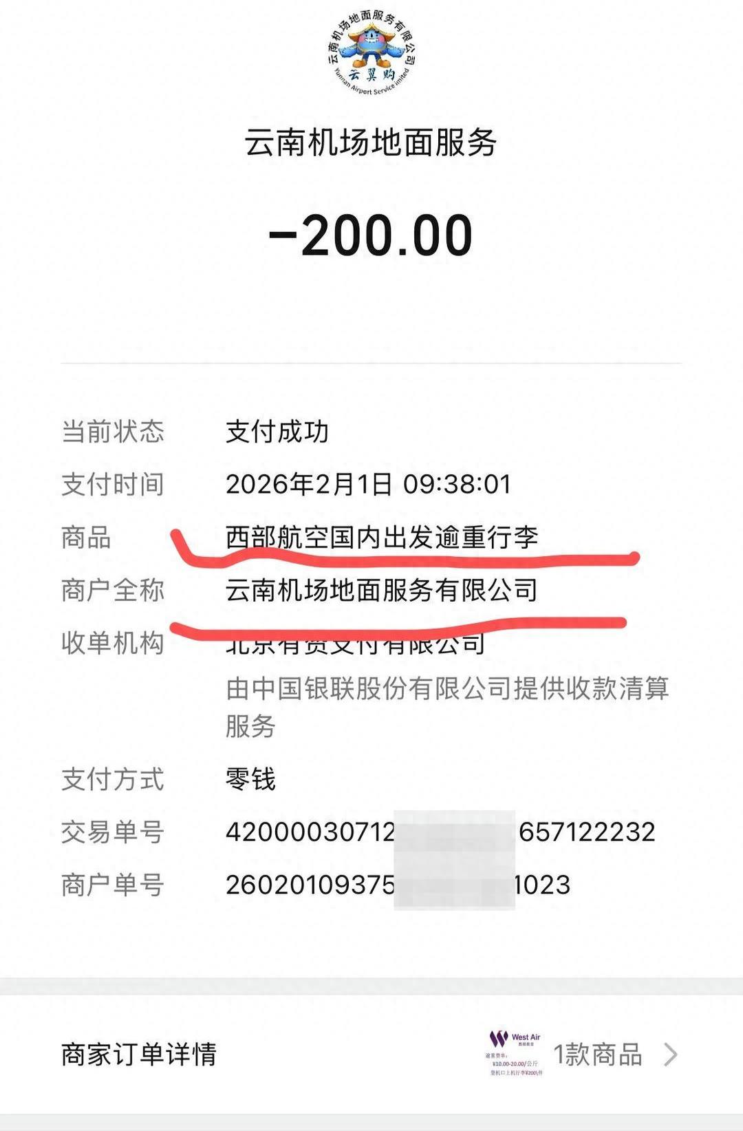 航旅纵横显示,朱智1月30日乘坐的西部航空航班,于9:27开始登机,计划起飞时间为9:50。朱智向记者提供的支付记录截图显示,朱智在9:38支付了200元费用。