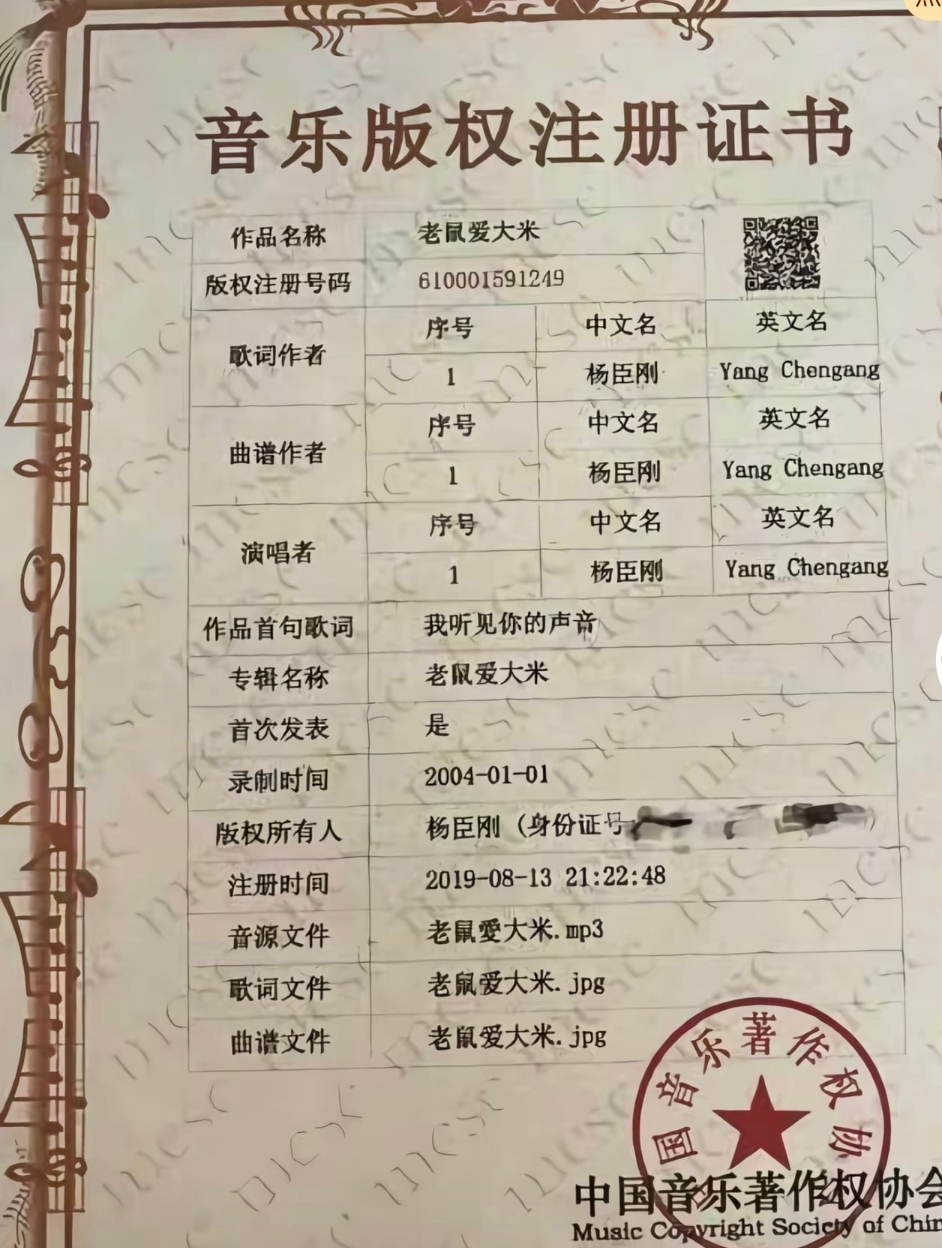 声明指出,歌曲《老鼠爱大米》(词曲创作:杨臣刚,创作完成时间2004年1月1日)的全部著作人身权(署名权、修改权、保护作品完整权等),永久归杨臣刚先生个人专属享有,受《中华人民共和国著作权法》保护,任何单位及个人不得侵犯。该作品的全部著作财产权(复制权、发行权、表演权、信息网络传播权、改编权等),由杨臣刚先生本人与北京老鼠爱大米文化发展有限公司共同合法享有并全权负责相关授权、维权等事宜,此前任何与此相悖的权属信息均为不实内容。