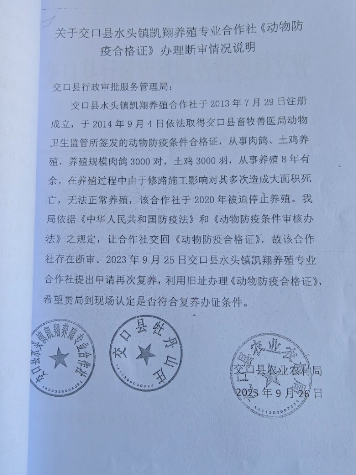 2022年6月7日,交口县农业农村局发给该县行政审批服务管理局的《关于交口县水头镇凯翔养殖专业合作社〈动物防疫合格证〉办理断审情况说明》中明确提到,该合作社是在养殖过程中由于修路施工影响,多次造成(养殖禽类)大面积死亡,无法正常养殖,该合作社于2020年停止养殖,《动物防疫条件合格证》断审。2022年6月5日,该合作社申请再次复养,但该场养殖集中区域到主要交通干线不足500米的距离,不符合防疫条件。