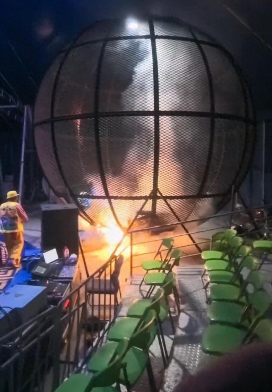 视频显示,球形铁笼内两辆摩托车高速追逐,其中一辆摩托车行驶至笼底后突然停滞不动,随后两车均停驶。紧接着笼底蹿出明火,引燃表演区,工作人员立即上前扑救,现场随后升起大量白烟。