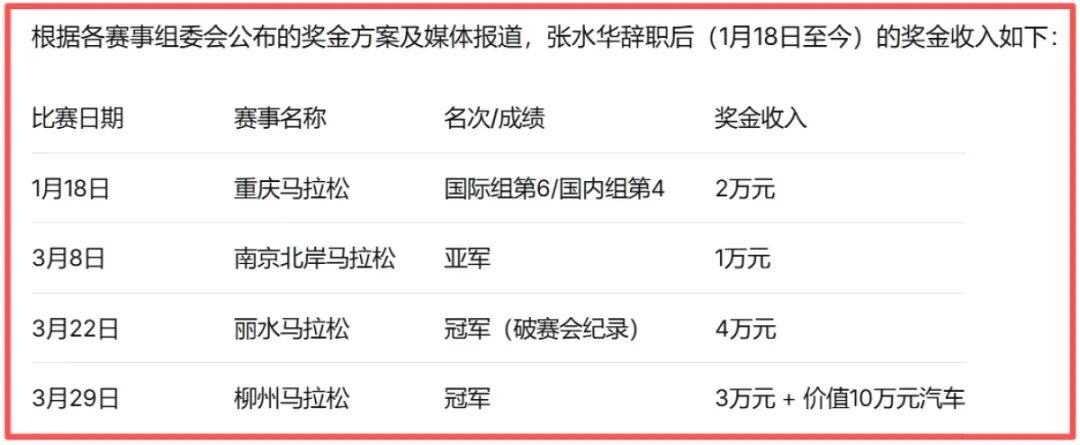 3月22日,丽水马拉松。这是张水华辞职后的首个冠军,她跑出2小时35分49秒,不仅夺得女子组冠军,还打破了赛会纪录。收获4万元奖金(1万冠军奖+3万破纪录奖)。