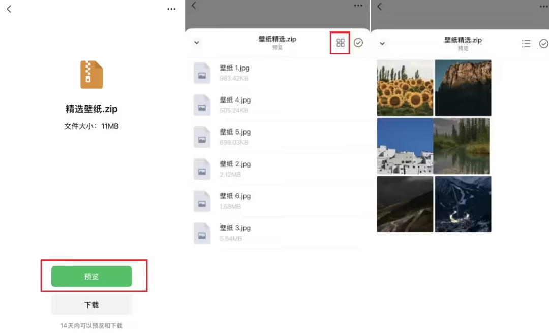 拥有灰度测试资格的用户现在再点击聊天界面中的压缩文件后,会发现底部新增了“预览”按钮,点击即可查看压缩包内文件列表,支持以列表或缩略图形式浏览,并可选择单个或多个文件进行转发、收藏或下载,无需下载整个压缩包。
