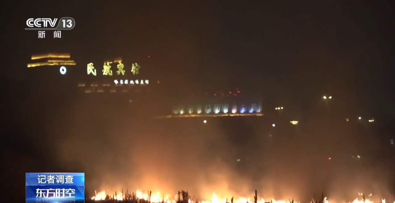 在哈尔滨太平国际机场旁边的立功村,离机场的跑道不到500米,秸秆在这儿随意焚烧,烟雾已经弥漫在周围,记者身后是一片火海。记者注意到,每隔几分钟,在跑道上就会有飞机进行起降,也没有任何人进行监管。