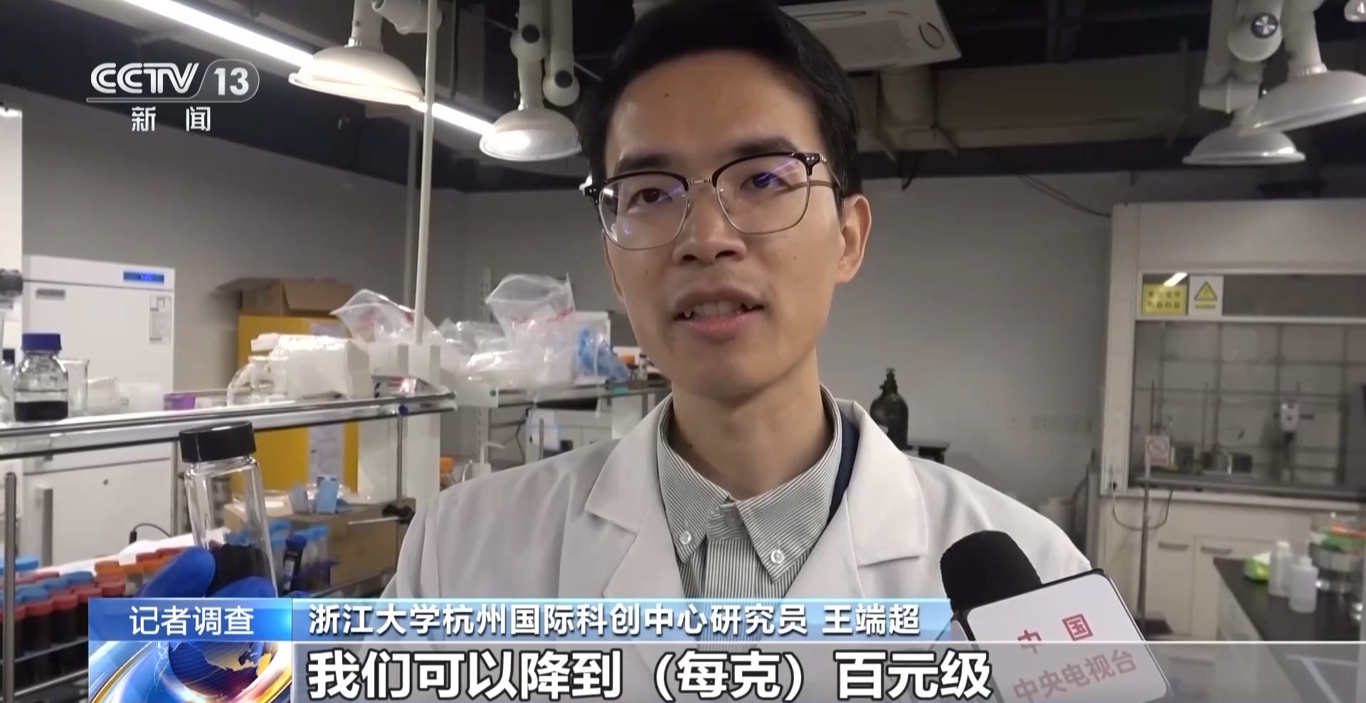 浙江大学杭州国际科创中心研究员 王端超:现在做的小规模实验,100公斤秸秆可以得到10公斤的黑色石墨烯粉体,现在按克卖,价格大约在3000元每克左右,可以降到每克百元级。