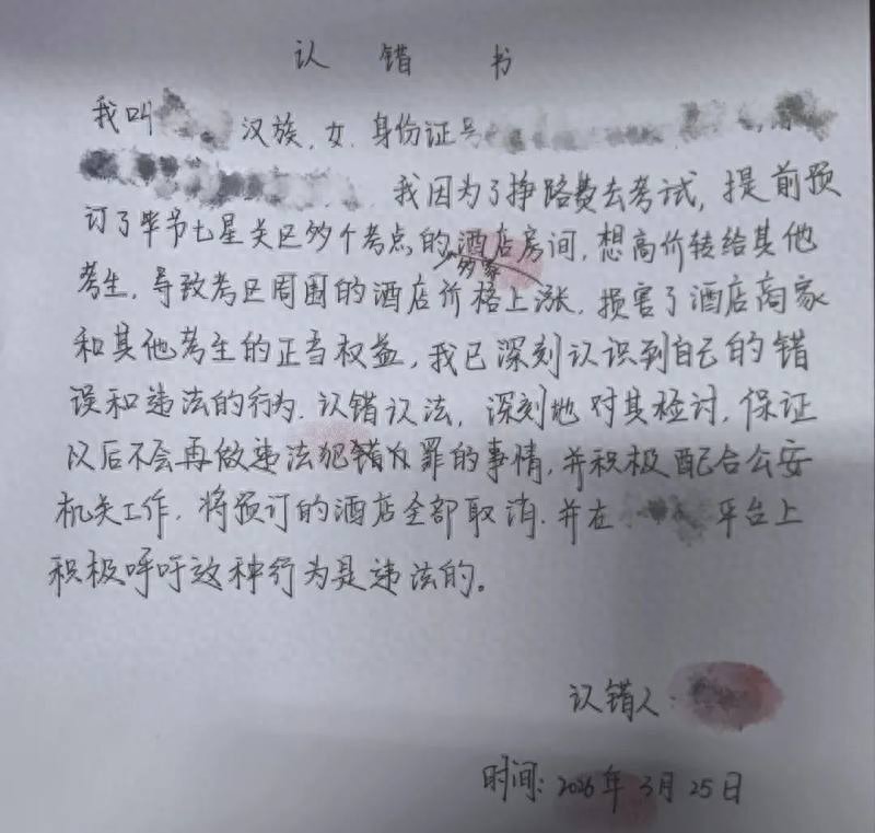 近日,有网友发帖称,贵州毕节七星关区一名准备参加事业单位招聘考试的女生,因提前预订当地多个考点周边的酒店房间,并准备以高价转卖给其他考生,被七星关区警方查处。网帖中附有一份手写认错书,该女子在文中表示,自己“为了挣路费去考试,提前预订了毕节七星关区多个考点的多家酒店房间,想高价转给其他考生,导致考区周围的酒店价格上涨,损害了酒店商家和其他考生的正当权益”。