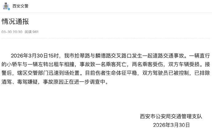 西安一直行轿车与左转出租车相撞致1名乘客遇难,2名乘客受伤,警方排除酒驾和毒驾嫌疑