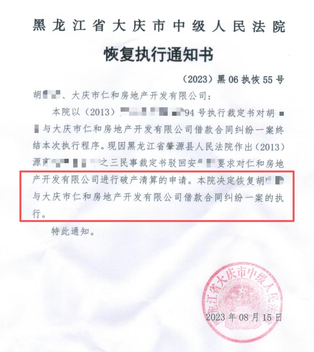 2023年8月15日,大庆市中级人民法院向胡女士发出了恢复执行通知书:“本院决定恢复胡女士与大庆市仁和房地产开发有限公司借款合同纠纷一案的执行。”