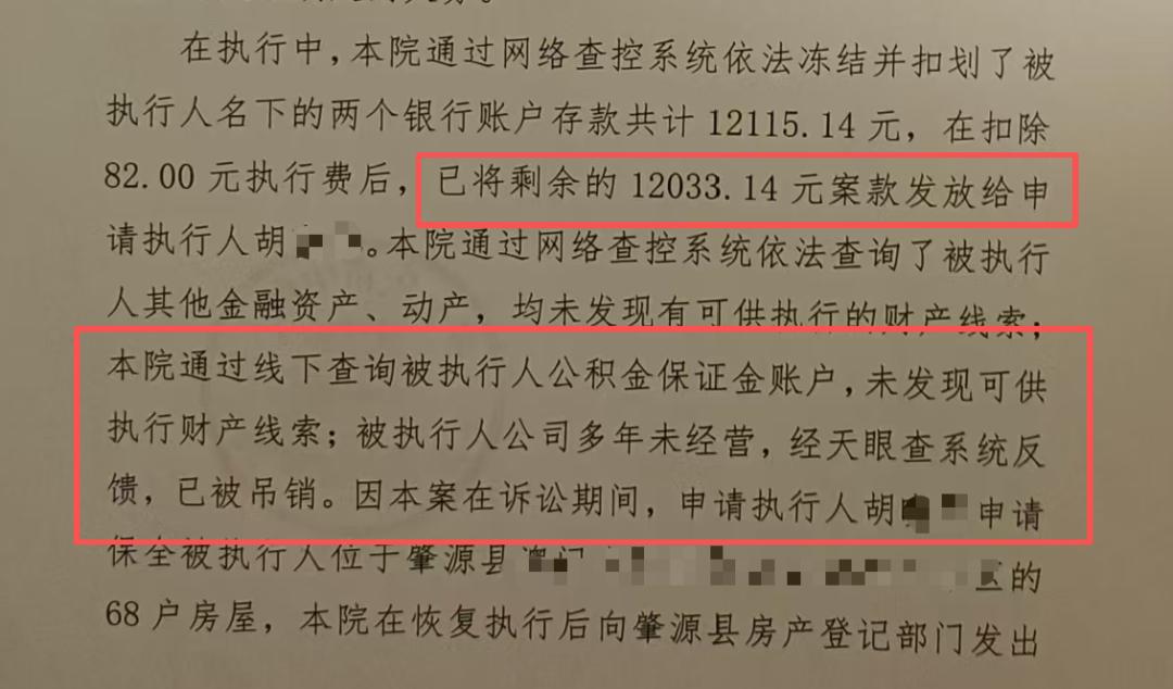 2025年5月22日,大庆市中级人民法院作出裁定:终结本次执行程序。裁定书显示,法院通过网络查控系统,仅扣划到房地产公司两个银行账户存款共计12115.14元,扣除82元执行费后,胡女士拿到了12033.14元。此外,被执行人房地产公司“多年未经营,已被吊销”,无其他可供执行财产。