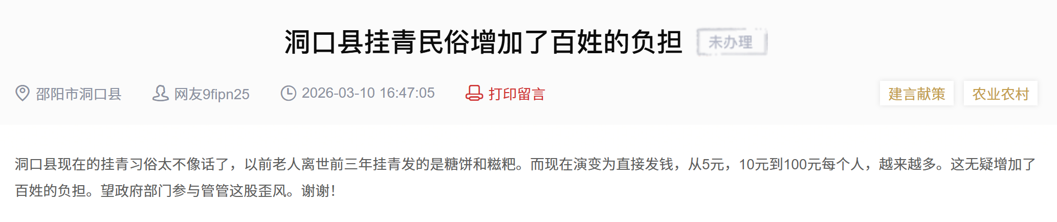 网民在“红网”发帖称挂(社)青民俗增加了百姓负担。