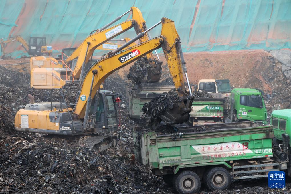 在玉龙垃圾填埋场环境修复工程现场,挖掘出来的垃圾被运走进行筛分(1月30日摄)。新华社记者 梁旭 摄