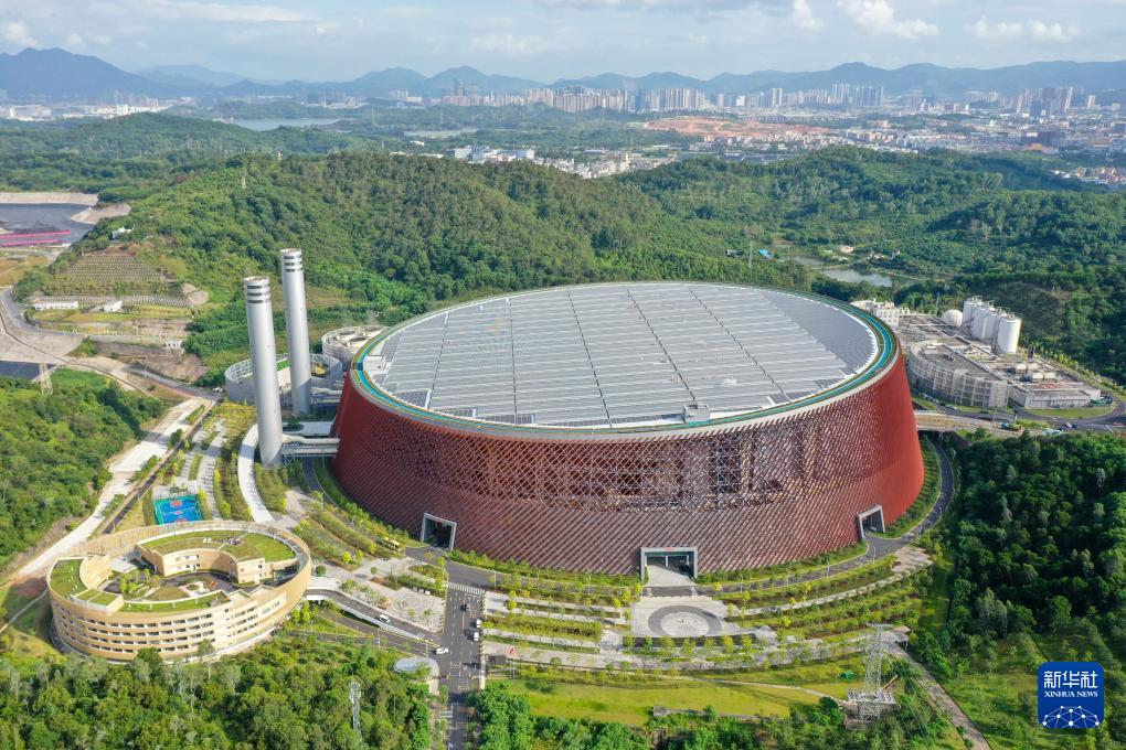 这是深圳龙岗能源生态园,从玉龙垃圾填埋场挖掘、筛分后的轻质物将被转运到这里焚烧发电(无人机照片,2023年8月8日摄)。新华社记者 梁旭 摄