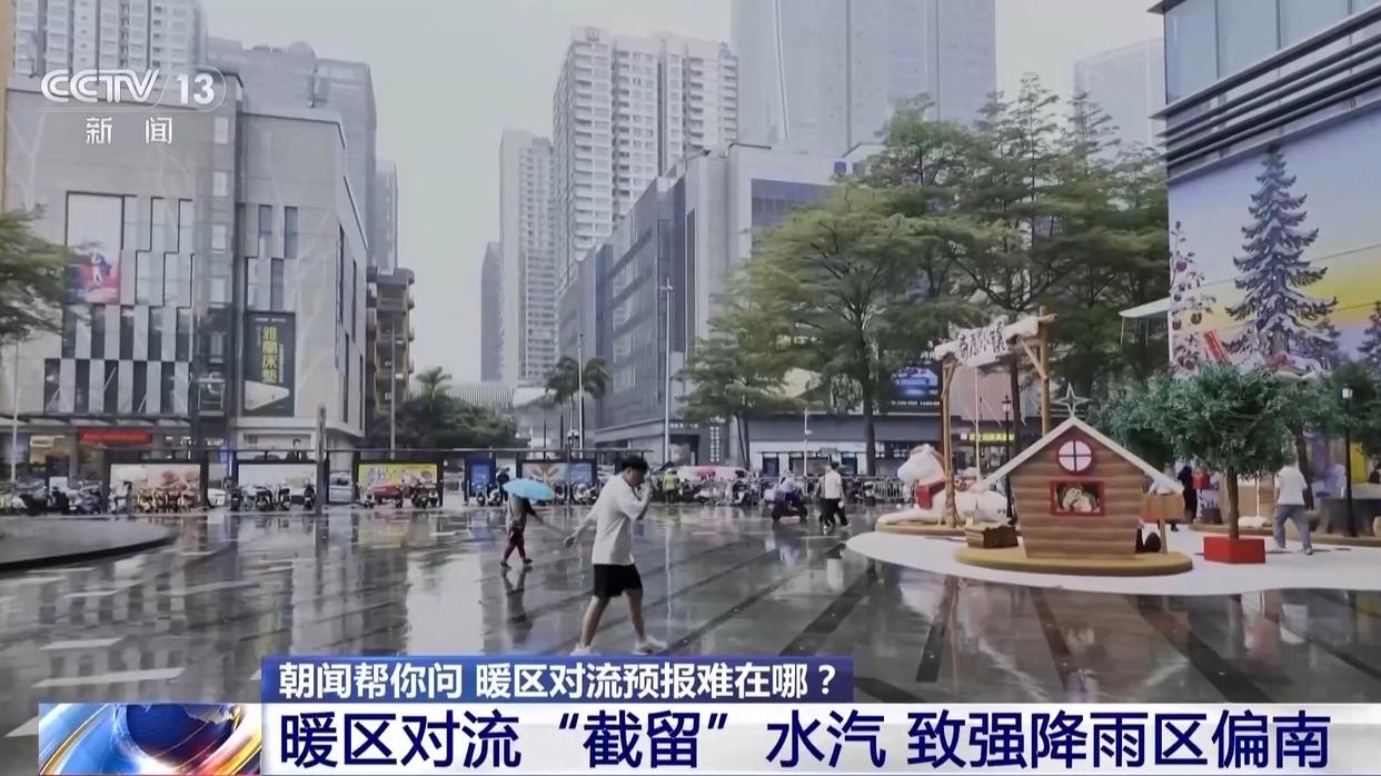 中国气象局气象分析师 林楠:正是由于这两天华南的暖区对流强度超预期,也就是在低空西南急流的水汽输送带上,出现了明显降雨,截留了水汽,导致强降雨区偏南,因此再往北的江南一带,冷暖空气交汇带来的降水反而没有预期强。