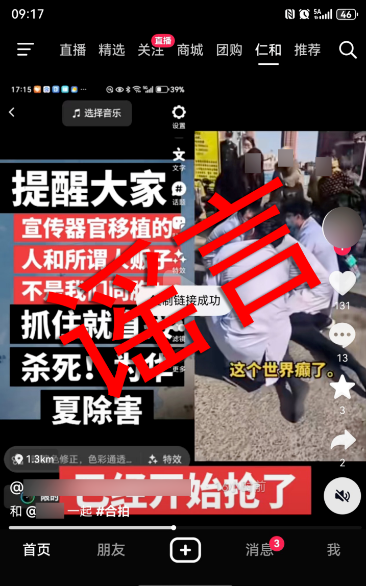 3月16日,网民纪某在抖音平台上发布了一张医务人员正在抢救病人的照片,并配文称"已经开始抢器官了”,造成了极为恶劣的社会影响。