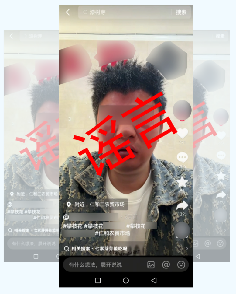 3月11日,网民赵某为达到引流效果,在抖音平台上发布了一段利用特效制作、显示自己脸部浮肿的视频。视频中,赵某谎称有人在攀枝花仁和农贸市场以“漆芽”冒充“椿芽”进行销售,导致其食用后出现严重过敏反应。
