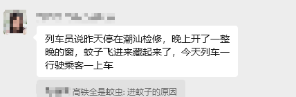 “列车员有上报,也有情绪安抚,但无具体措施。列车员说昨天停在潮汕检修,晚上开了一整晚的窗,蚊子飞进来藏起来了,今天列车一行驶,乘客一上车,蚊子就都飞出来了。”该网友说,他们希望尽快解决问题,并要求车票补偿。