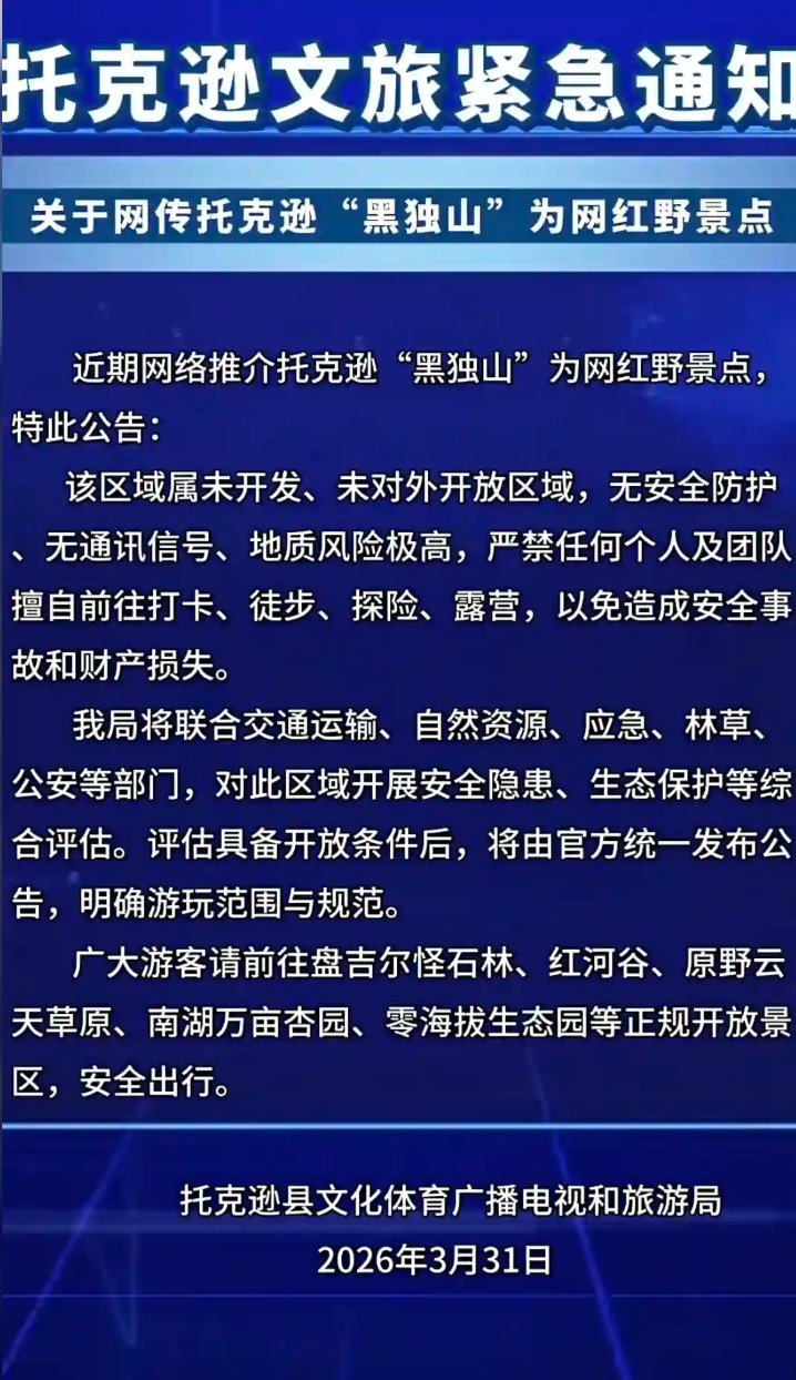 托克逊文旅紧急通知:“黑独山”为未开发野景点 严禁擅自前往