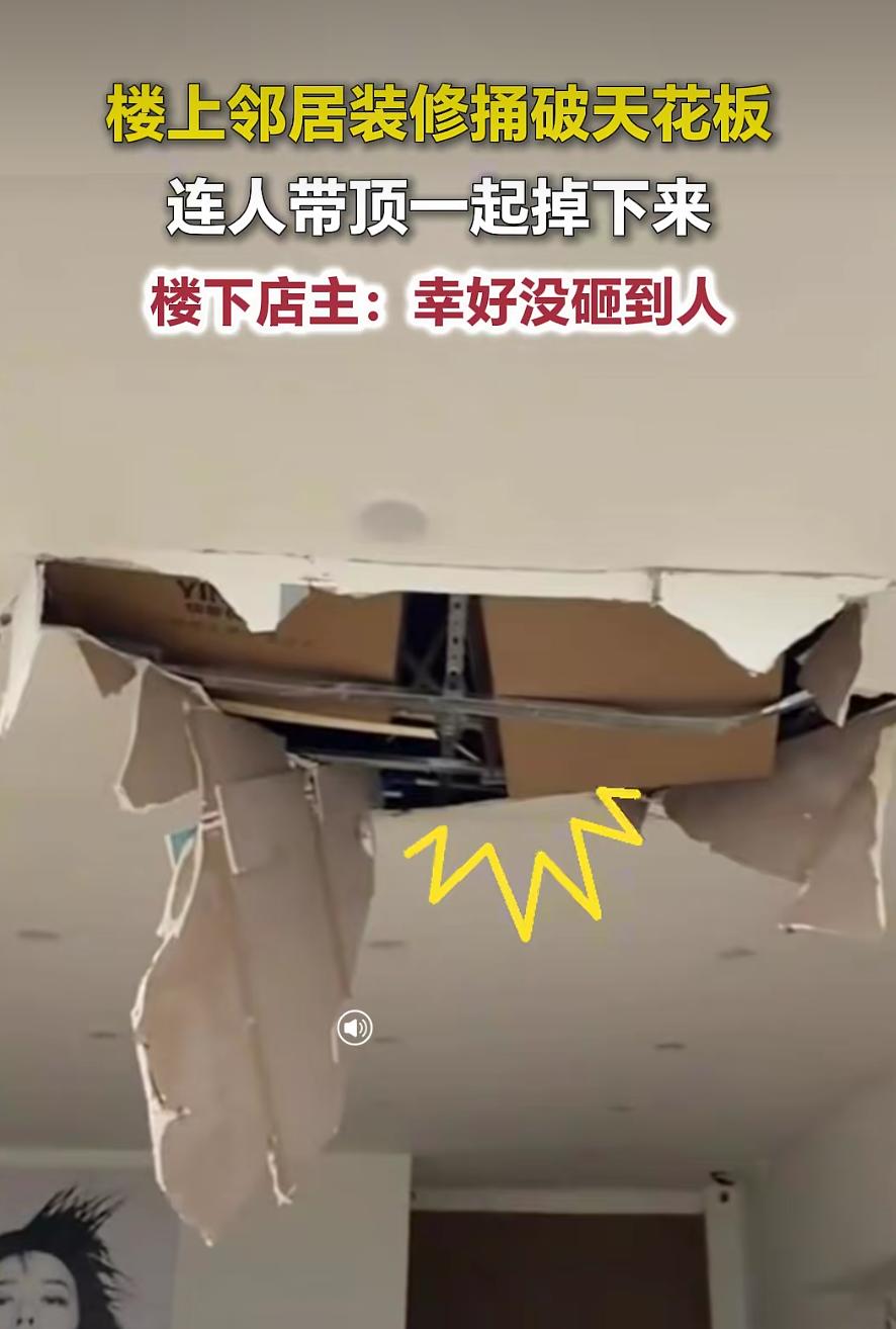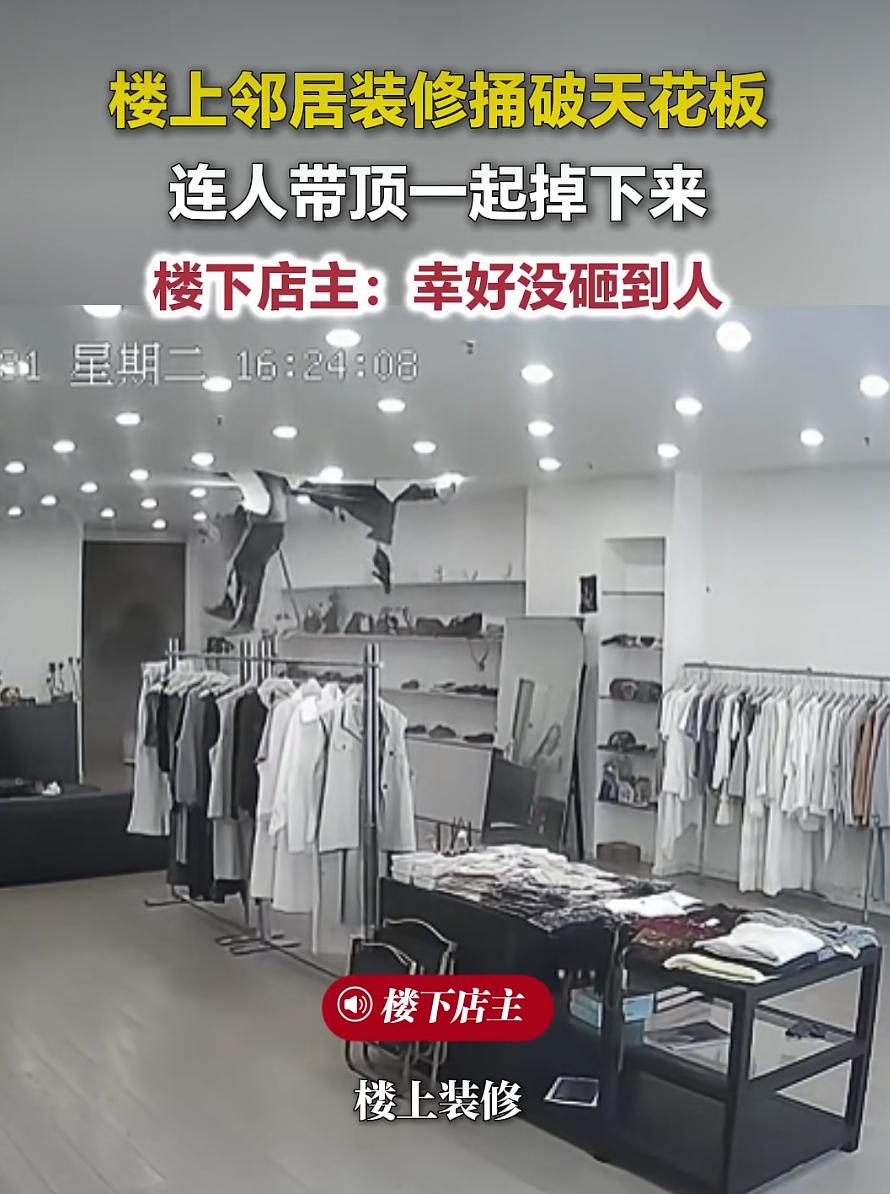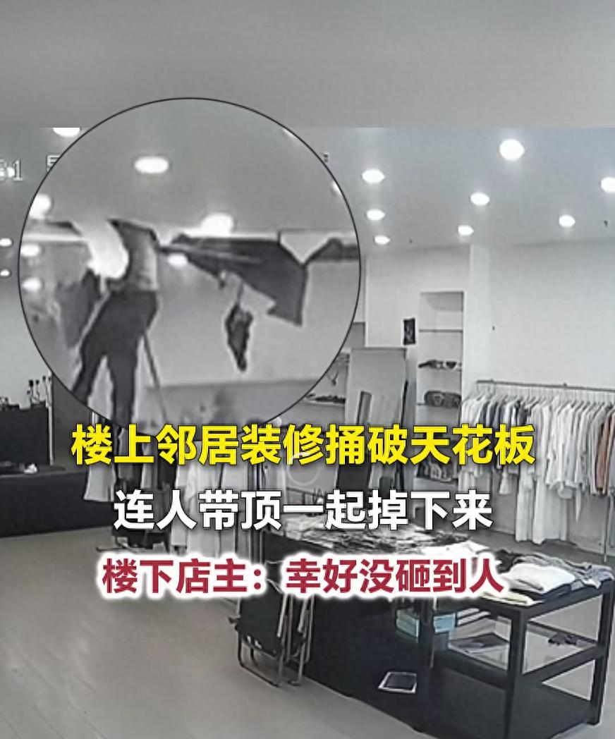 安徽亳州一女装店突遇意外,楼上装修不慎将天花板捅破,一名装修工人坠落店内,店主:幸好店内无人,没人受伤,楼上邻居已承诺维修
