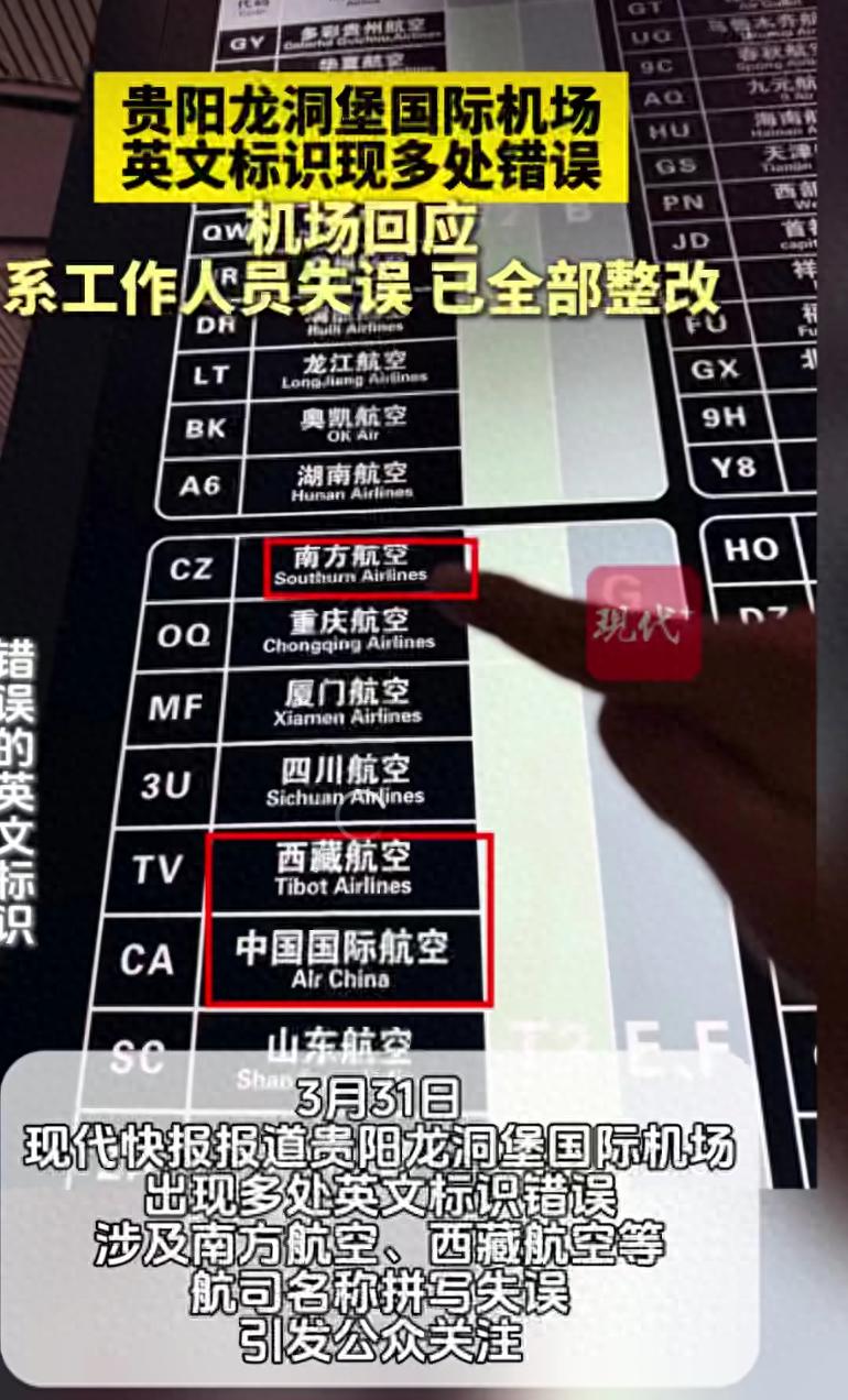 3月31日,现代快报报道贵阳龙洞堡国际机场出现多处英文标识错误,涉及南方航空、西藏航空等航司名称拼写失误,引发公众关注。4月1日,机场方面正式回应称,错误标识已全部整改到位。