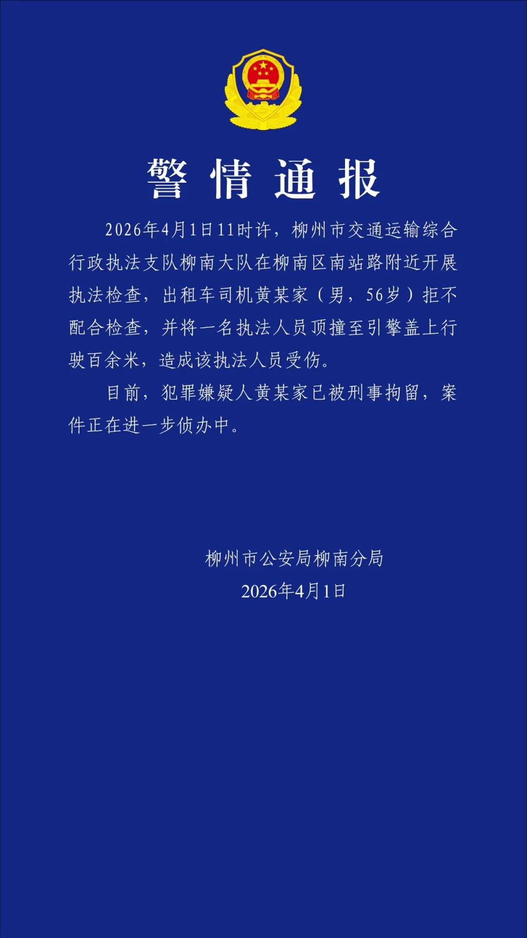 2026年4月1日11时许,柳州市交通运输综合行政执法支队柳南大队在柳南区南站路附近开展执法检查,出租车司机黄某家(男,56岁)拒不配合检查,并将一名执法人员顶撞至引擎盖上行驶百余米,造成该执法人员受伤。