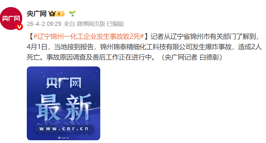 记者从辽宁省锦州市有关部门了解到,4月1日,当地接到报告,锦州锦泰精细化工科技有限公司发生爆炸事故,造成2人死亡。事故原因调查及善后工作正在进行中。(央广网记者 白德彰)