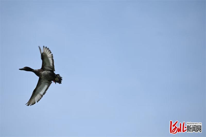 4月2日上午,全球首次青头潜鸭野化放飞活动在衡水湖举行。图为放飞后的一只青头潜鸭,在衡水湖上空飞翔。河北日报记者 焦磊 摄