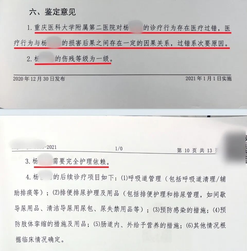 同年5月11日,该所出具司法鉴定意见书称,杨先生处于植物生存状态,他的伤残等级为一级,重医附二院对杨先生的诊疗行为存在医疗过错,医疗行为与他的损害后果之间存在一定的因果关系,过错系次要原因。