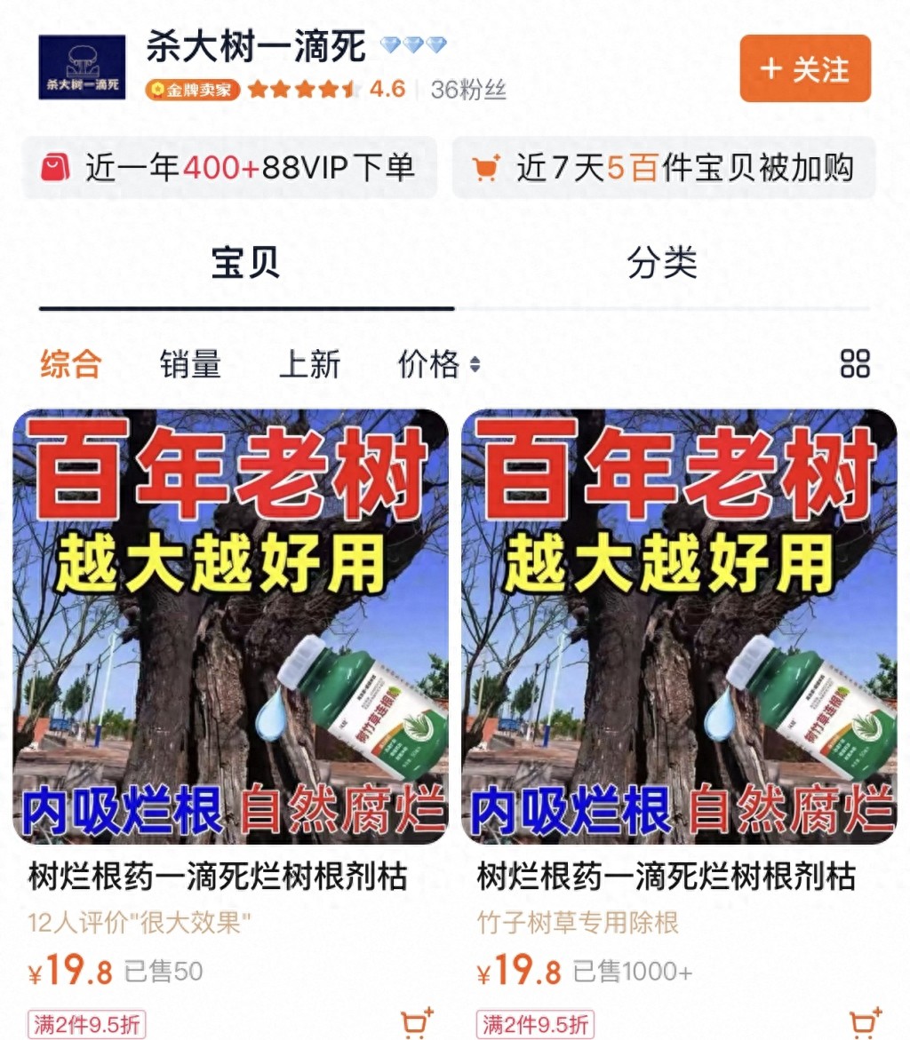 一家名为“杀大树一滴死”的某平台店铺,正在销售一款名为“枯树王”的产品,单价19.8元,显示已售出超过1000件。产品宣传页称,该药为“林用除草剂”,对大树、竹子、杂草均有极大杀伤性,可通过浇根或喷洒方式使用,并配以“叶枯萎,烂根部”“老树连根烂,一滴枯千里”等宣传语。