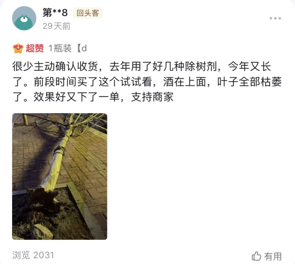 在买家评论区,不少人晒出毒杀公共绿化带、市政道路旁树木甚至邻居家树木的所谓“成果”,理由包括遮挡阳光、影响停车、风水不佳,乃至于“怕台风天砸到房子”。