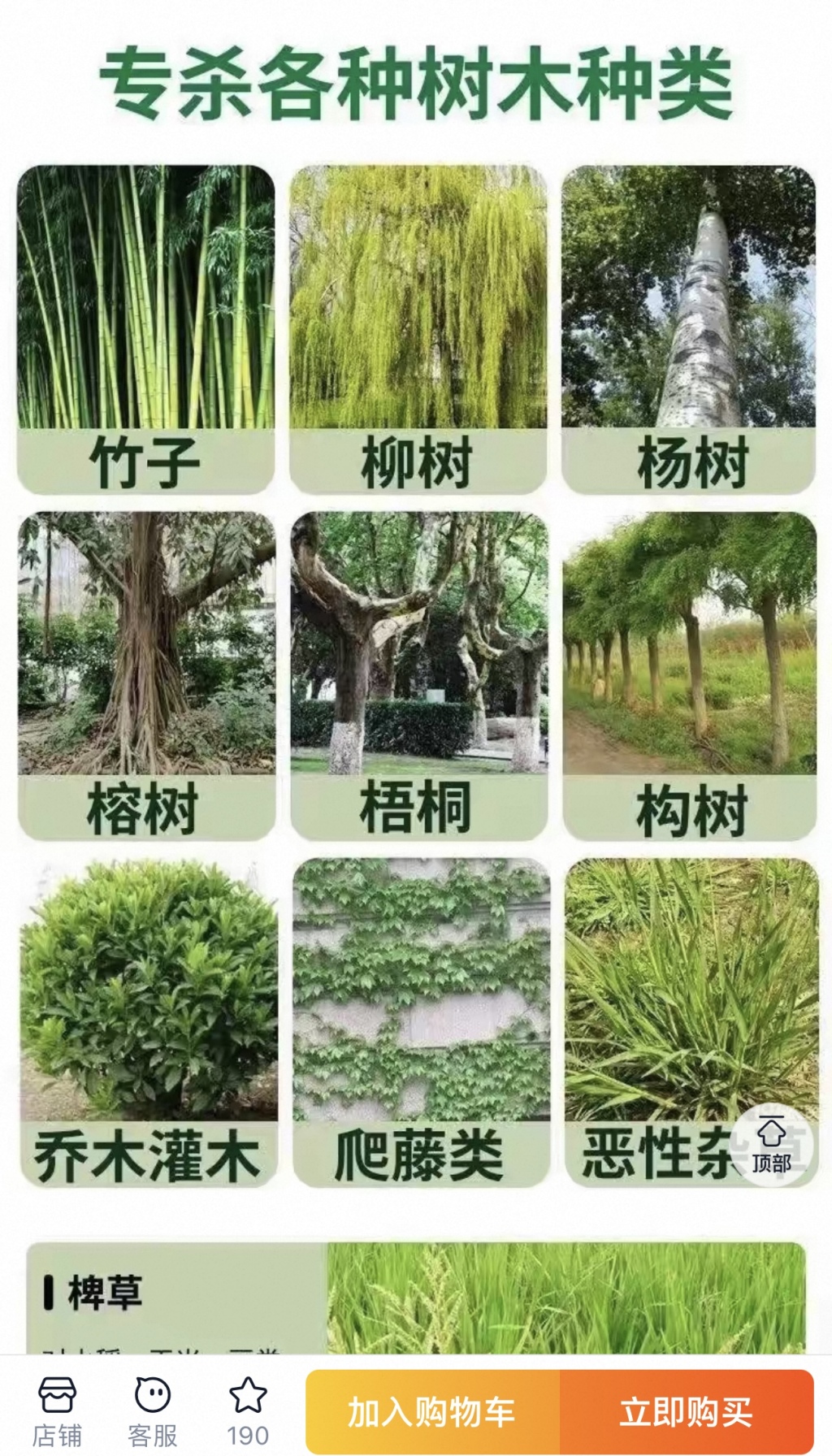 商家展示可毒杀的树木、杂草等种类。